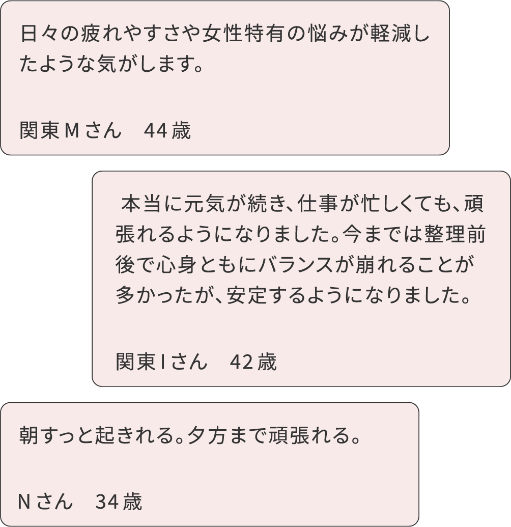 マカは良質なタンパク質のもととなる必須アミノ酸を多く含みます。また、グルコシノレート、ステロイド、トリテルペン、フェノール化合物、フラボノイド、タンニン等、すぐれた栄養素のバランスで、年齢を重ねる女性へエールを送ります。